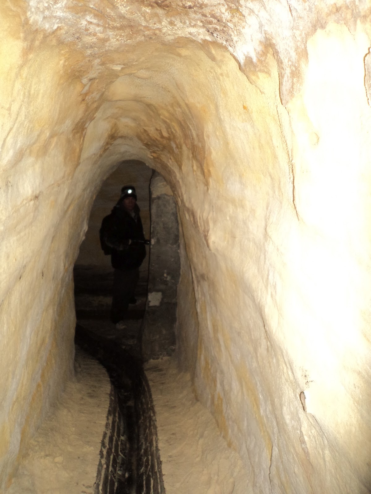 Biff and I soon discovered that one can easily become lost in the lab and decided that keeping track of our progress with chalk was the simplest solution at the time. Tunnels split left and right for literally miles without an end in sight. The water would rise near our knees and then drop to ankle level in a different part of the same tunnel. Water would pour down vertical drop shafts and seep from cracks behind sealed side passageways. It seamed that at every turn Biff or I would say "Holy shit!" or something similar at each new discovery.